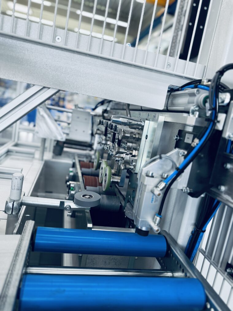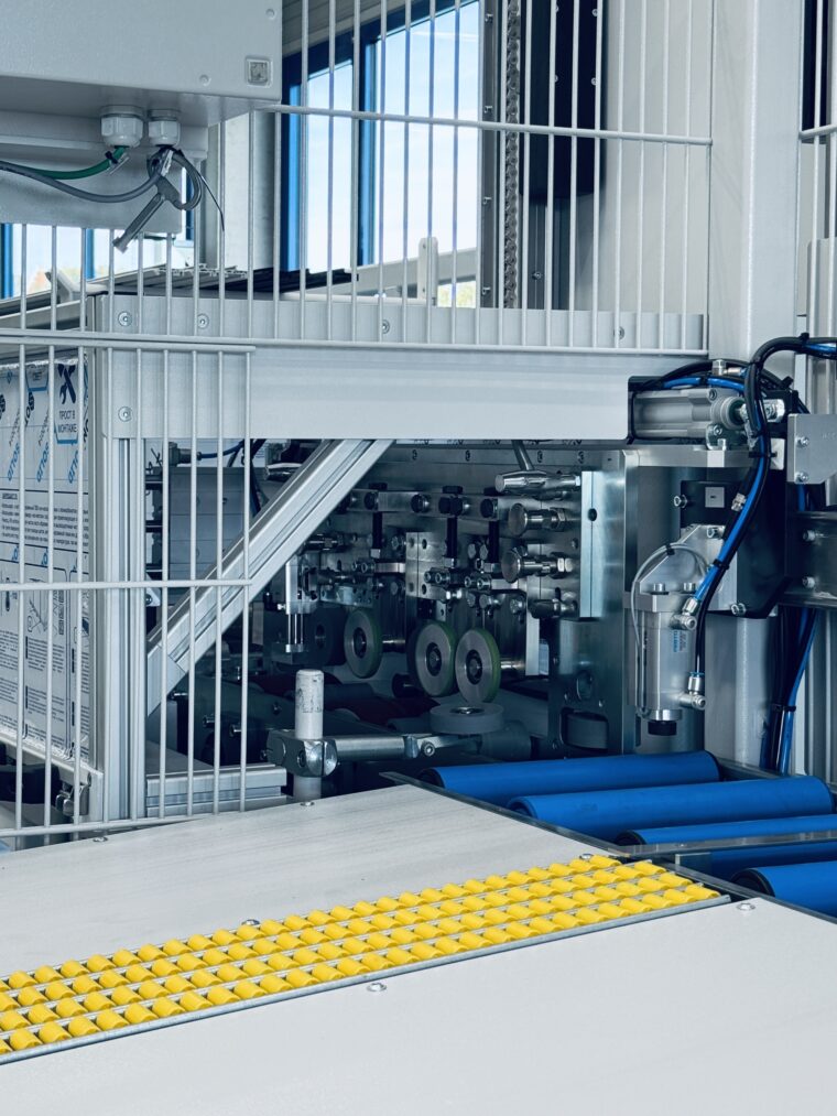 Die vormontierte Einheit durchläuft eine speziell entwickelte Verpressstation, in der die beiden Profile über mehrere synchronisierte Rollen formschlüssig miteinander verbunden werden. Im Anschluss wird die fertig verpresste Schwelle in die Auslaufstation transportiert, wo ein automatisches Abschubsystem die Bauteile für die weitere Verarbeitung bereitstellt.