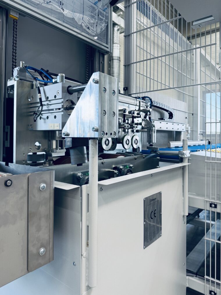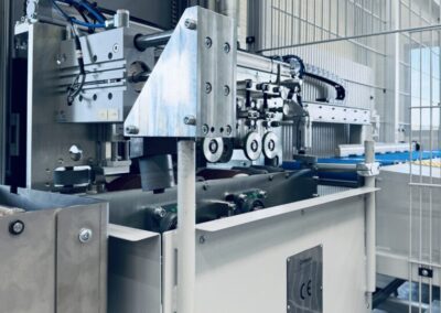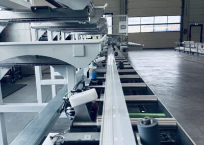 In der ersten Station werden die extrudierten Profile bevorratet und manuell durch einen Bediener auf eine Rollenbahn aufgelegt. Dies ermöglicht eine ergonomische und effiziente Zuführung in den weiteren Prozess. - Fixierung und Ausrichtung